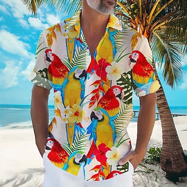 Herre Fugl Påfugl Tropiske planter Hawaii skjorte Skjorte med knapper Aloha skjorte Kortermet Hawaiisk Feriereise Ferie Strand Klær Sommer Vår Aftæpning 3D-utskrift krage skjorter Aprikos