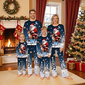 Familiestil Jul Julefamiliepyjamas Pyjamas Familiesett Grafisk julenissen Rådyr Julegaver Trykt mønster Mørkeblå Langermet Daglig Matchende antrekk
