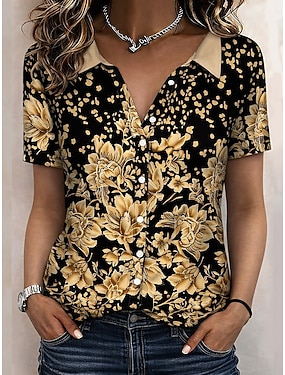 Kvinnens skjorte kortermet blomstrete grafisk bohem vintage tropisk ermeløs skjortekrage regular topper daglig blå brun grønn lyseblå sommer vår 1950-tallet interstellar atom