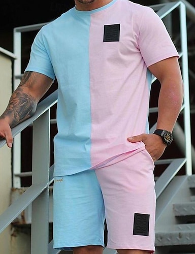 Herre Kontrastfarge 2stk T-skjorter sett Sommertopper Kortermet Korte bukser Crew-hals Sport Fritid utendørs Feriereise Sport 3D-utskrift Sommer Rødstrupe-egg Blå