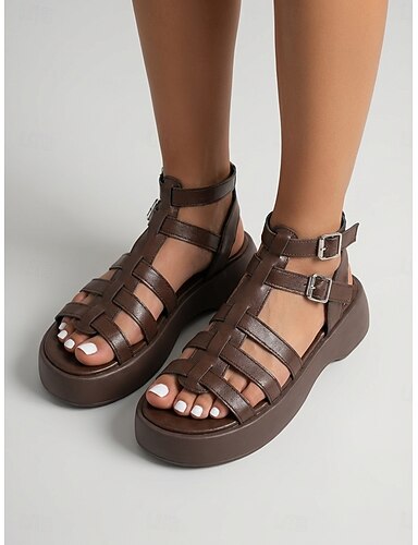 Brune platåsandaler med gladiatorer til dame – uformelle vevde sandaler med justerbare spennestropper, lette sommersko for reiser og ferier &daglig bruk