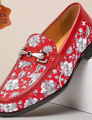 Herre røde blomstrete jacquard-loafers med metallbit og slip-on-sko, stilig statement-fottøy for bryllupsgjester, banketter, fester, scenearrangementer og kveldsklær