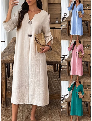 Dame Midikjole Imitert bomullslin Skiftkjole Uformell kjole Bomullskjole Mote Moderne Daglig Helg Løstsittende عادي Langermet V-hals Blå Hvit Rosa Grønn Sommer Vår Høst