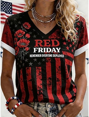 dame rød fredag t-skjorte grafisk bokstaver stilig klassisk avslappet korte ermer v-hals vanlig topper daglig ute helg svart og rød