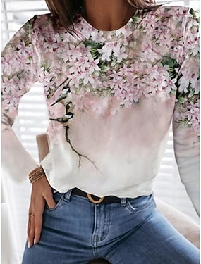 Dame T skjorte Trykt mønster Blomstret Grafisk Planter Årgang Mote Stilfull Langermet Crew-hals Rund hals Vanlige topper Daglig Helg Blå Rosa Lilla Grønn Sommer Vår Høst