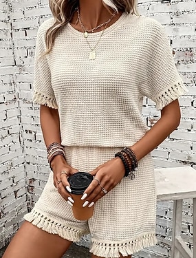 Dame Todelt sett T skjorte Shortssett Kortermet Crew-hals Helfarge Dusk Mote Gatemote Avslappet Daglig utendørs Svart Kakifarget Beige Sommer Normal