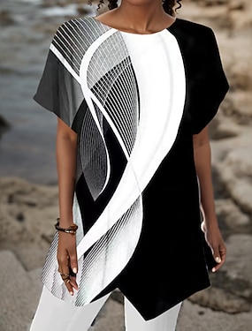 Kvinners Bluse Asymmetrisk Hem Grunnleggende Abstrakt Trykk Kortermet Lange Topper Rund hals Uformell Sølv Svart Hvit Blå Khaki