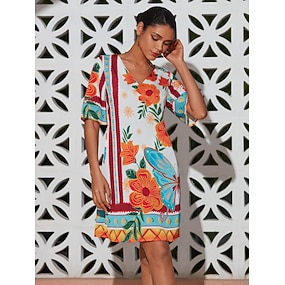 blomstertrykk v-hals halvlange sommerkjole oransje blomstermønster avslappet ferie strandantrekk elegant stil minikjole