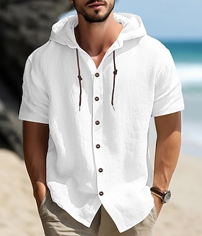 Herre Skjorte Linskjorte Uformell skjorte Skjorte med knapper عادي Feriereise Gate Svart Hvit Blå Kakifarget Kortermet Med hette Sommer Klær Justerbar snorhette
