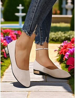 Hvite teksturerte ballerinasko til dame – slip-on-sko med rund tå og gullfarget hæl for damer, perfekt for daglig pendling, hageturer eller helgeturer