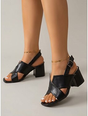 kvinners svarte peep toe chunky hæl sandaler – elegante imiterte skinn pumps med åpen tå for kontor og fest