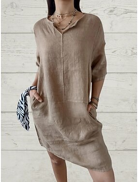 Dame Lin-lignende Faux Bomull Lin Mini Kjole Skift Kjole Sommer Kjole Casual Hverdags Løs Passform Plain 3/4 Lengde Erme V Hva Hvit Mørk Grå Beige Grå Sommer Vår