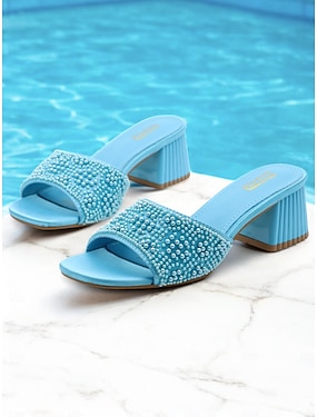 lyseblå, perlepyntede muldyr med blokkhæl for kvinner – elegante slip-on-sandaler med åpen tå for sommerfester og kveldsklær