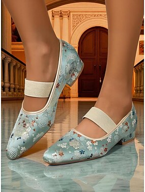 Lyseblå jacquard Mary Jane-sko til dame - rokokkoinspirerte, komfortable tursko med blomsterbroderi og elastisk stropp, middelaldersk eventyrstil for vintage-elskere, kostymefester og hverdagsfester