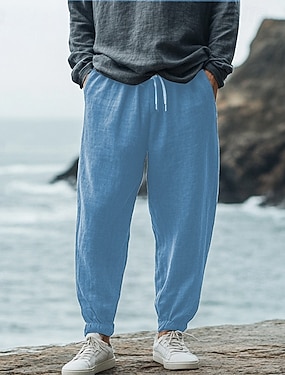 Herre Linbukser i bomull Bukser Sommerbukser Posete bukser Strandbukser Lomme Helfarge Komfort Pustende Full lengde Avslappet Daglig utendørs Ferie Mote Blå Svart Uelastisk