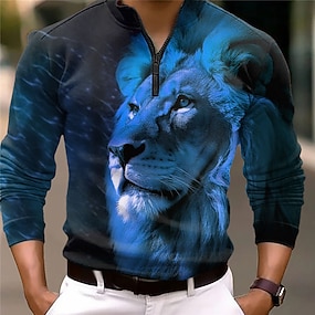 Herre Løve Poloskjorter med glidelås Golf skjorte Langermet Poloskjorter Skjorter med krage Fritid Morsom Gateklær Ferieklær Festantrekk 3D-utskrift Kvart zip-polo Svart Rød Blå