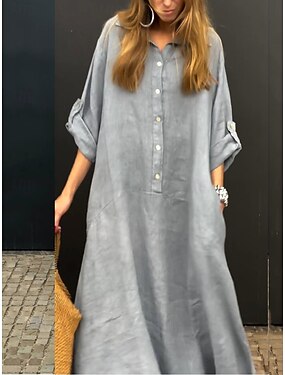 Dame Midikjole Imitert bomullslin Skiftkjole Fritid Daglig Løstsittende عادي Langermet Knaphul Grå Sommer Vår Høst