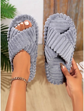 myke, hvite tøfler på kryss og tvers for kvinner – koselige plysjsandaler med åpen tå og slip-on for innendørs komfort og avslapning