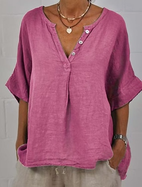 Dame Skjorte Skjorter i bomullslin Bluse Imitert bomullslin Lomme Knapper عادي Aktiv Stilfull 3/4 ermer V-hals Vanlige topper Daglig Gateklær Ferie Svart Lilla Oransje Rose Rosa Grå Sommer Vår