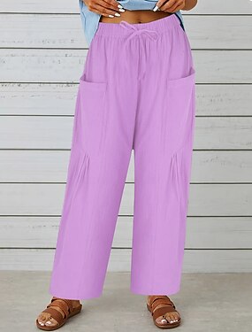 Dame Imitert bomullslin Frekk kinesisk Sommerbukser Ferie Gatemote Fritid Full lengde Middels midje Helfarge Lomme Elastisk midje Komfort Bekvem Pustende Mikroelastisk Daglig utendørs Gate Lilla
