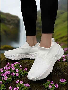 Hvite strikkede slip-on plattformsneakers med kilehæl til dame – komfortable, tykke athleisure-sko for daglige gåturer, ærender og reiser
