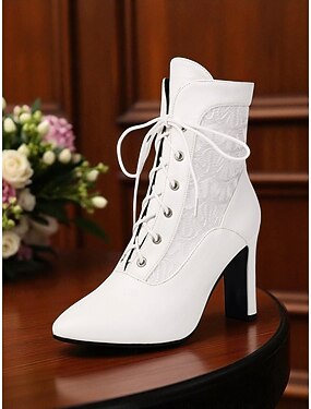 hvite ankelstøvletter for kvinner – bryllupssko med snøring med hjerte- og perledekor, tykk hæl for vintage-inspirerte bruder
