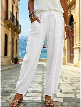 Dame Imitert bomullslin kinesisk Sommerbukser Ferie Gatemote Fritid Ankel-lengde Middels midje Helfarge عادي Lomme Elastisk midje Bekvem Pustende Uelastisk Daglig utendørs Gate Hvit Mørk Marinebl