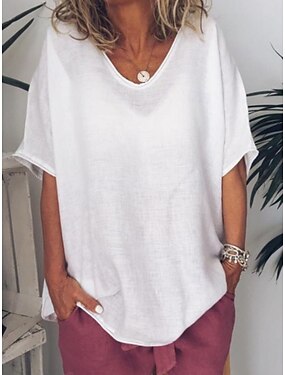 Dame T skjorte Imitert bomullslin T-skjorte عادي Mote Stilfull Klassisk Kortermet V-hals Vanlige topper Daglig Ut på byen Helg Blå Svart Hvit Rosa Brun Sommer Vår