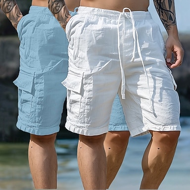 Herre Shorts Lin Shorts Sommershorts Strandshorts Snorer Elastisk midje Multi lomme عادي Knelengde utendørs Ferie Strand Ferie Hawaiisk Hvit+Himmelblå Hvit + khaki Uelastisk