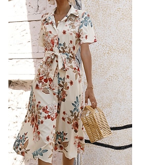 Dame Midikjole Uformell kjole Elegant Stilfull Fritid Feriereise Daglig Normal Blomstret Kortermet Skjortekrage Aprikos Lyseblå Sommer Vår