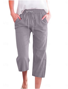 Dame Capri-bukser Imitert bomullslin kinesisk Sommerbukser Ferie Grunnleggende Fritid Kalv lengde Middels midje عادي Snorer Lomme Lettvekt Pustende Uelastisk Hjem utendørs Feriereise Vinrød Lysegr