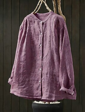 Dame Linskjorte Sommerskjorte Skjorte med knapper Imitert bomullslin Rynket Daglig Stilfull Fritid Langermet Crew-hals Lange topper Ferie Ut på byen Ferieklær Lilla Vår Høst