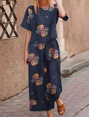 Dame Todelt sett Buksesett Imitert bomullslin Kortermet Crew-hals Blomstret Trykt mønster Mote Gatemote Dagligdagstøy Stevnemøte Hvit Gul Navyblå Sommer Normal