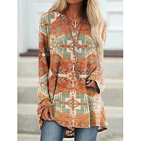 Dame T skjorte Trykt mønster Grafisk Stamme Årgang Stilfull Fritid Langermet Crew-hals Lange topper Daglig Blå Himmelblå Oransje Brun Kakifarget Vår Høst