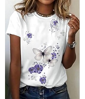 Dame T skjorte Trykt mønster Blomstret Sommerfugl Stilfull Fritid Kortermet Crew-hals Vanlige topper Daglig Hvit Sommer