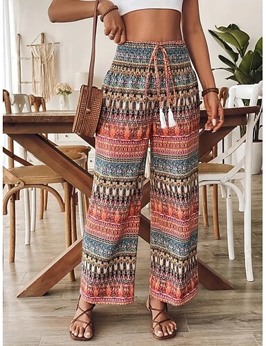 Dame Bred Bukseben Bukser Fritid Bohem Full lengde Høy Midje Trykt mønster Lomme Elastisk snordesign Pusteevne Myk Mikroelastisk Feriereise Gate Dagligdagstøy Rød Grønn Sommer Vår Normal