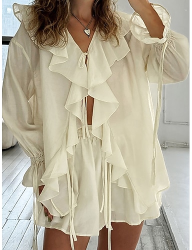Dame Skjorte Bluse Rynket Blondér Drapering Helfarge عادي Elegant damer Klassisk Langermet V-hals Vanlige topper Daglig Arbeid Ferie Hvit Beige Sommer Vår