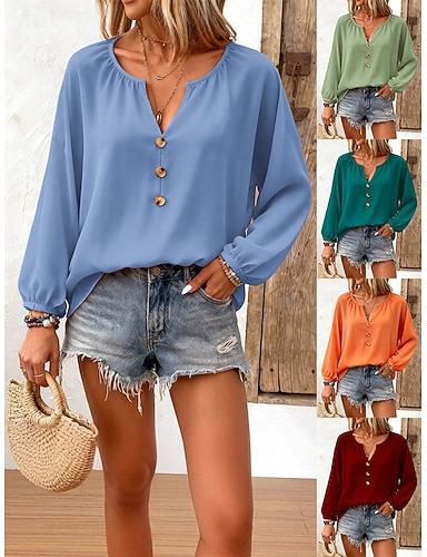 Dame Bluse Knapper Helfarge Stilfull Fritid Langermet V-hals Vanlige topper Daglig Blå Lysegrønn Vin Oransje Grønn Sommer Vår Høst