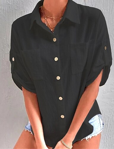 Dame Skjorter i bomullslin Bluse Lomme Knapper عادي Elegant Årgang Stilfull Halvlange ermer Skjortekrage Vanlige topper Daglig Ferie Ut på byen Svart Hvit Grå Sommer Vår