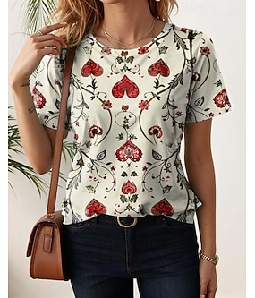 Dame T skjorte Trykt mønster Blomstret Fritid Kortermet Rund hals Vanlige topper Daglig matt-hvit Sommer