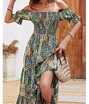 Dame Lang kjole Maxikjole Kjole med A-linje Sommerkjole Boho-kjole Elegant Bohem Stilfull Feriereise Daglig Stevnemøte Normal Grafisk Kortermet Løse skuldre Grønn Mørkeblå Sommer