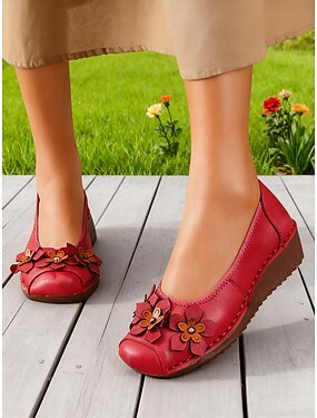 Røde damesko med blomstermotiv – håndlagde retro 3D-blomster og komfortable kilehæler til jobb og fritidsbruk