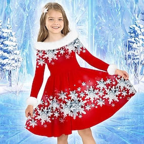Barn Jente Kjole Snøfnugg Langermet Avslappet Pelskanter Crewneck Bedårende Daglig Polyester Ovenfor knéet Uformell kjole Swingkjole Kjole med A-linje Høst Vinter 2-13 år Vin Rød Blå