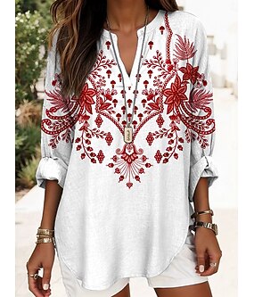 Damebluse i linlignende pustende lett tunika V-hals langermet boho casual topper blomster grafikk vintage vanlig topper daglig trykk hvit rød kongeblå lilla grønn