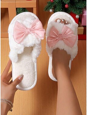 Dametøfler i fuskepels med rød sløyfe – koselige, flate juletøfler innendørs til vinterferien og hjemmefesten