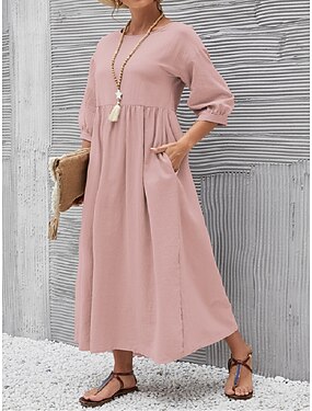 dame midikjole i imitert bomullslin shiftkjole avslappet daglig løs passform ensfarget 3/4-ermet rund hals blå svart rosa vinrød sommer vår høst