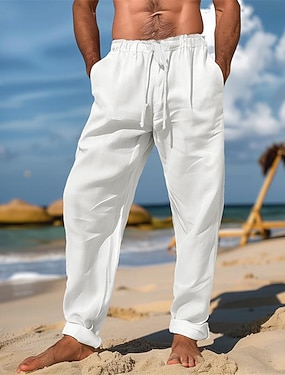 Herre Linbukser Bukser Sommerbukser Posete bukser Strandbukser Elastisk midje Snorer Rett ben عادي Komfort Pustende Full lengde utendørs Ferie Strand Ferie Mote Hvit Militærgrønn