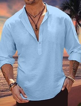 Herre Skjorte Linskjorte Popover skjorte Sommerskjorte Strandskjorte Helfarge Feriereise Ferie Svart Hvit Rosa Blå Langermet Henley Klær