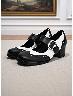 Damesko fra 1950-tallet med vintage Mary Jane-motiv – elegante svarte blokkhæler i lakk i kunstskinn med kamskjelldetaljer for retrofester og rockabilly-arrangementer. &Midt-århundrets stil