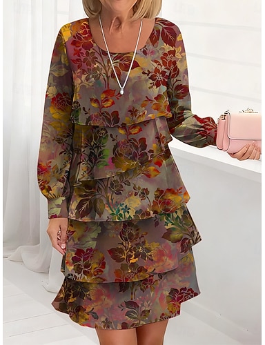 Dame Midikjole Kjole med A-linje Fritid Daglig Normal Blomstret Grafisk Langermet Crew-hals Blå Rød Lilla Grønn Høst Vinter
